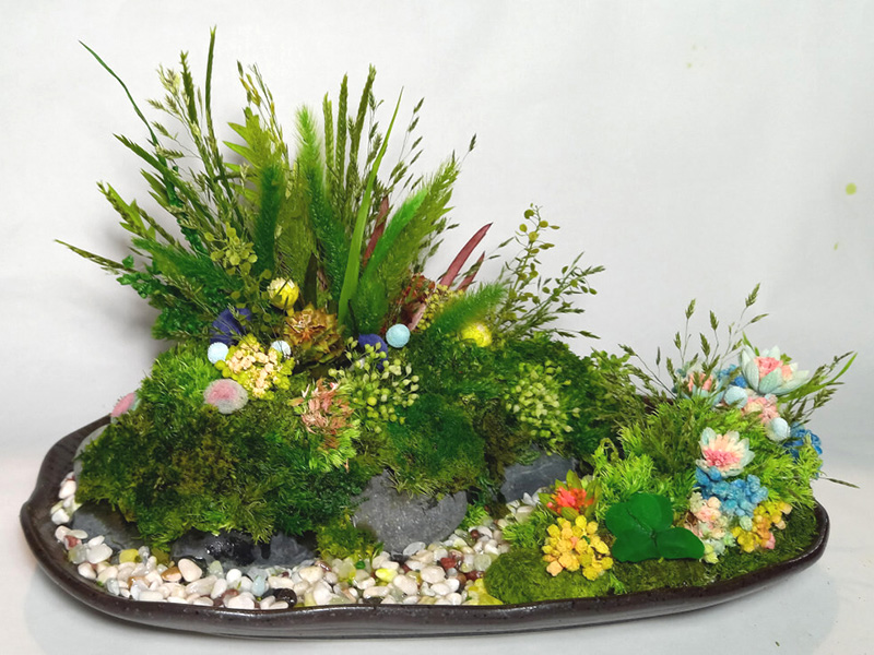 京華クラフトでは、道端や河川敷などで採集した植物たちを自社にてプリザーブド加工しています。市販の花材やお手元にある花類なども加え、長い間眠っているカップやお皿など(ひび、かけ等が多少あっても可)を活用した、サスティナブルな商品開発を行なっております。このように生まれた商品を、ミラクルクラフトと呼んでいます。